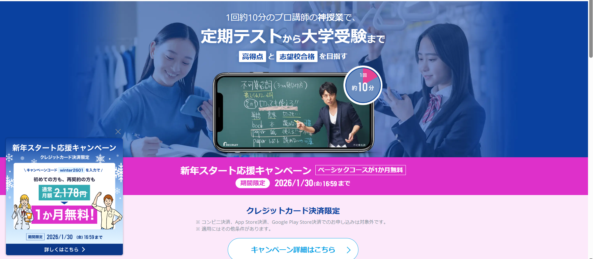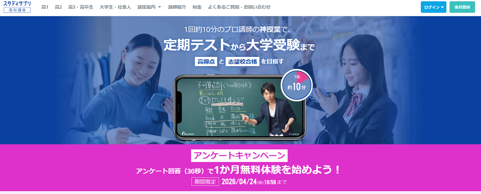 スタディサプリ高校・大学受験講座は、リクルートが提供する高校生向けのオンライン学習サービスです。